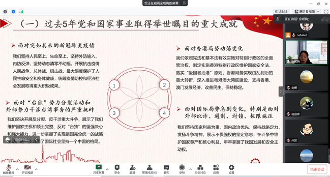 首先,金瑶梅教授以“学习贯彻党的二十大精神,开拓新时代中国特色社会主义发展新境界”为主题开讲。金教授在开篇带领大家学习了党的二十大的报告内容,回顾了过去五年的工作和新时代十年的伟大变革。她指出,党的二十大强调走中国式现代化道路,实现中华民族的伟大复兴。只有实现社会主义现代化,才能真正满足人民对美好生活的需求。因此,必须要坚持党的全面领导和全面从严治党,推动高质量发展本领、服务群众本领、防范化解风险本领,牢牢把握工作主动权,来应对即将面临的风险挑战。