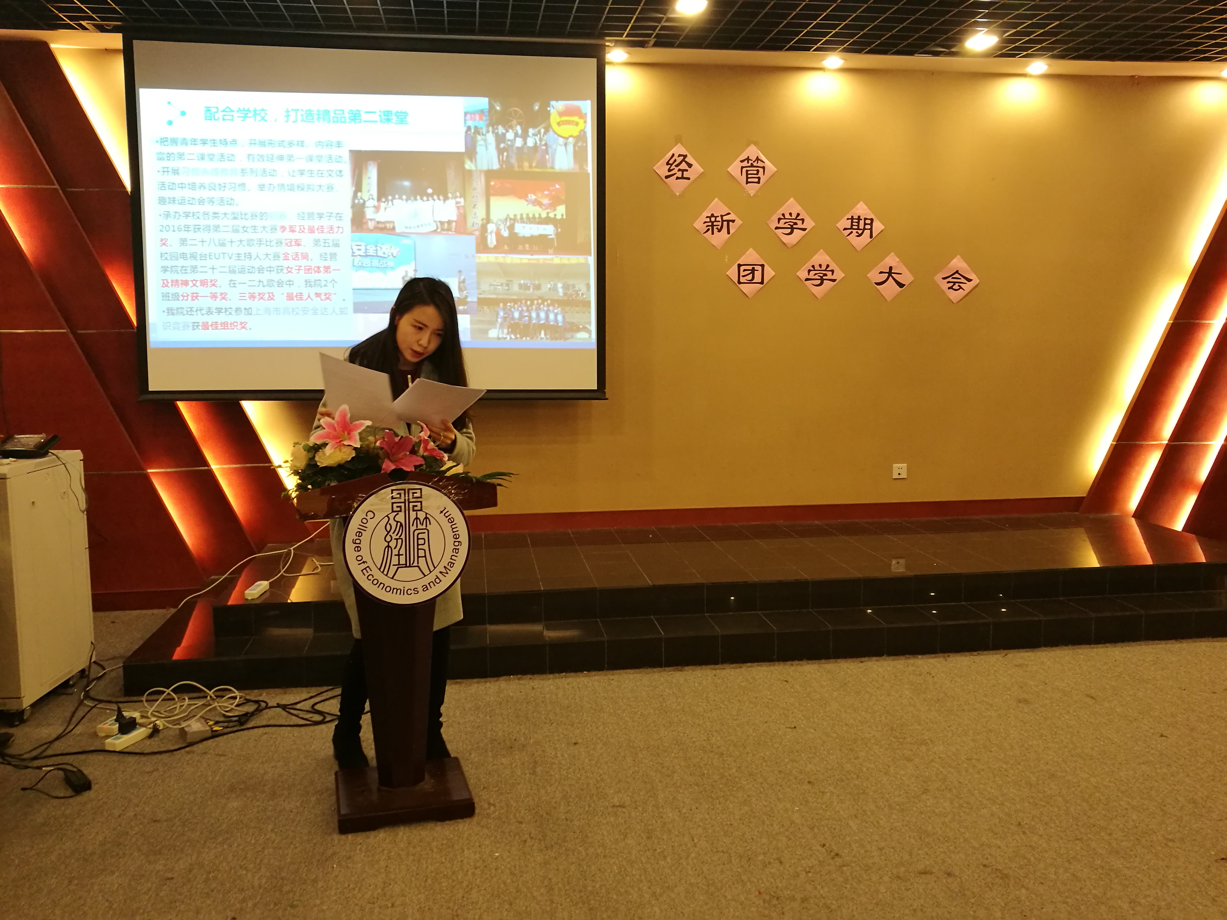 分团委书记齐永晓首先感谢了在做每一位同学对团学的付出, 2016年学院团学的工作在全校排名第一与每一位同学的努力密不可分。为了大家解读了今年的分团委几项重点工作:立足于增加团学凝聚力和吸引力的团学文化建设;建立并完善精英化学生干部培养的体系;夯实基层团务,建立实效性和竞争性活动举办机制;党建带团建、协助党委把握基层学生动态;育人为本,丰富学院学生文化活动。希望大家能够在团学收获成长和感动,团学能够带给你们的不止是一份工作经历更是一种人生经历,希望大家能够爱团学,希望大家一起开启经管团学新的篇章。