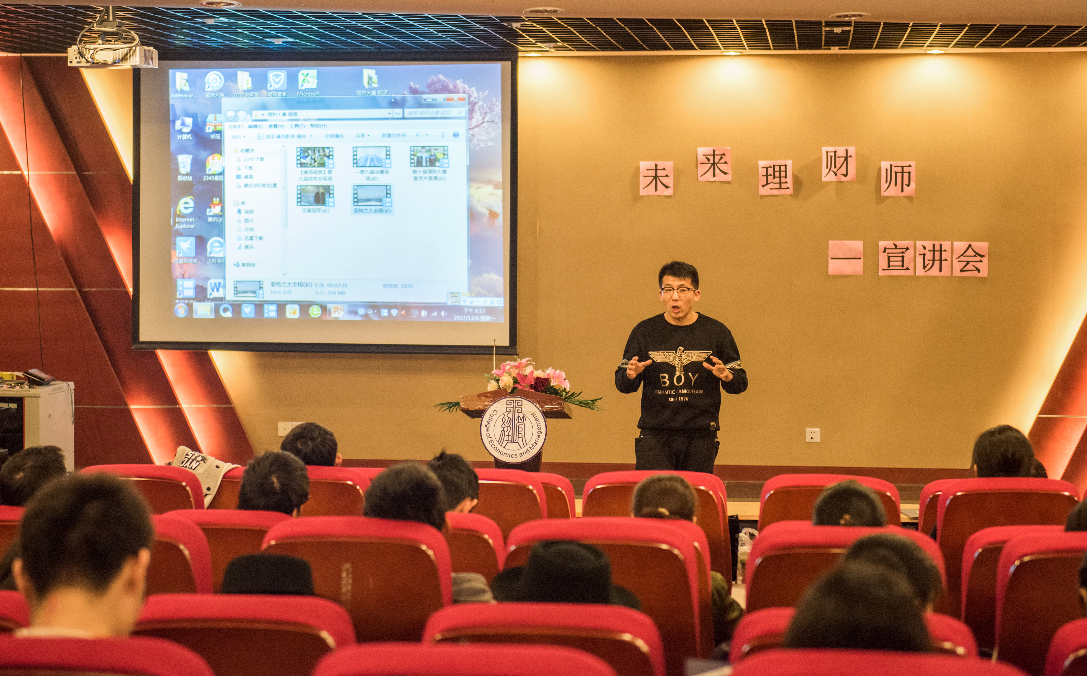 第一财经广播证券主持人、第四届“未来理财师”大赛冠军――秦川,为同学们讲解了本次大赛的历史和赛程,并和大家分享自己的参赛心得,鼓励同学们积极参加比赛。本次大赛分为“菁英赛”、“企业实习”、“常规赛”、“赴美实习”四个项目。