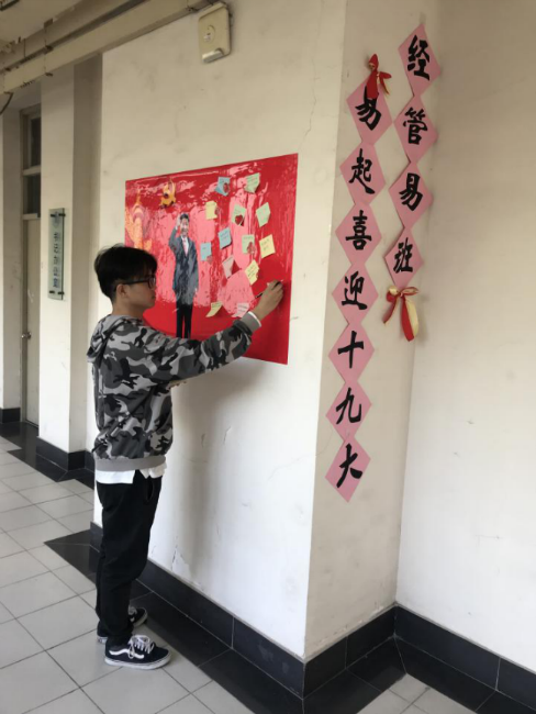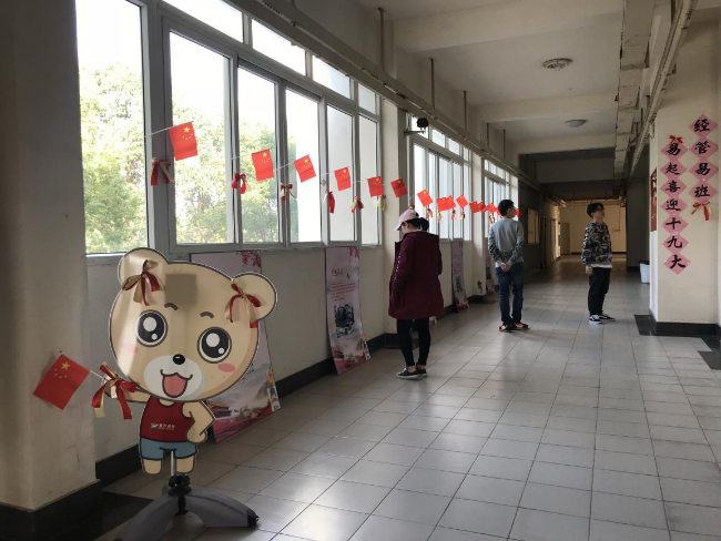 10月10日至10月17日,经管易抹红点缀崇德楼辅导员办公室外长廊。满眼的鲜红小国旗和中国传统红黄搭配的蝴蝶结,烘托着迎盛会的喜庆和全体师生的欢乐心情,吸引了路过的教职工和学生驻足观看历届党的重大会议展板集锦,回顾我党96年来的光辉历程。走廊上还设置了寄语墙,不少同学寄语盛会,表明要沿着党指引的方向健康成长、全面发展、不忘历史、牢记使命。