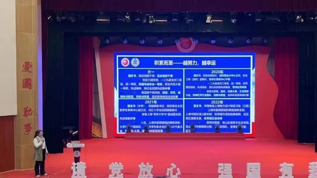 “挑战杯”上海市大学生课外学术科技作品竞赛一等奖、青年五四奖章集体、“知行杯”上海市大学生社会实践项目大赛一、二、三等奖等十余项奖项获得者来自电子与信息工程学院的顾佳明分享了她作为赴宁夏固原实践队一员时的所见所感。她从实践准备、实践项目实施、实践对宣传推广等角度分享了参与社会实践的经历和经验。鼓励同学们极投身社会实践的大舞台,在社会实践中了解社会、磨练意志、锻炼品质,增长才干!