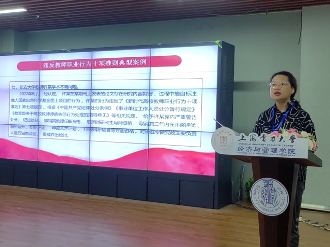 学院纪检委员容庆作党风廉政工作汇报,通报了上海教育系统和高校在落实全面从严治党工作中的典型案例,通过典型案例来加强警示教育,使全体党员受警醒、明底线、知敬畏,牢记立德树人的崇高使命,营造风清气正的政治生态和育人环境。