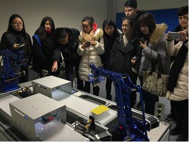 在当天的活动中,创客学院负责人详细讲解了现在热门的科技――增强现实(AR)技术,展示了AR在各行业中的应用案例,如:医疗、旅游、教育、家装等行业。还为师生们演示了由“塔普“开发的增强现实(AR)制作平台生成的工业4.0智慧工厂AR说明方案。在师生们了解相应的理论知识后,来到智能硬件展厅参观,亲自体验科技创新产品。创客学院内的智能硬件展厅是中国第一个智能硬件线下平台,展品涉及可穿戴智能、医疗器械、消防安保、智能家居等,大部分都是创客们自主创新的成果。本次参观学习,给师生们带来了很大的启发,为学院创客班的建立积累了一定的素材。