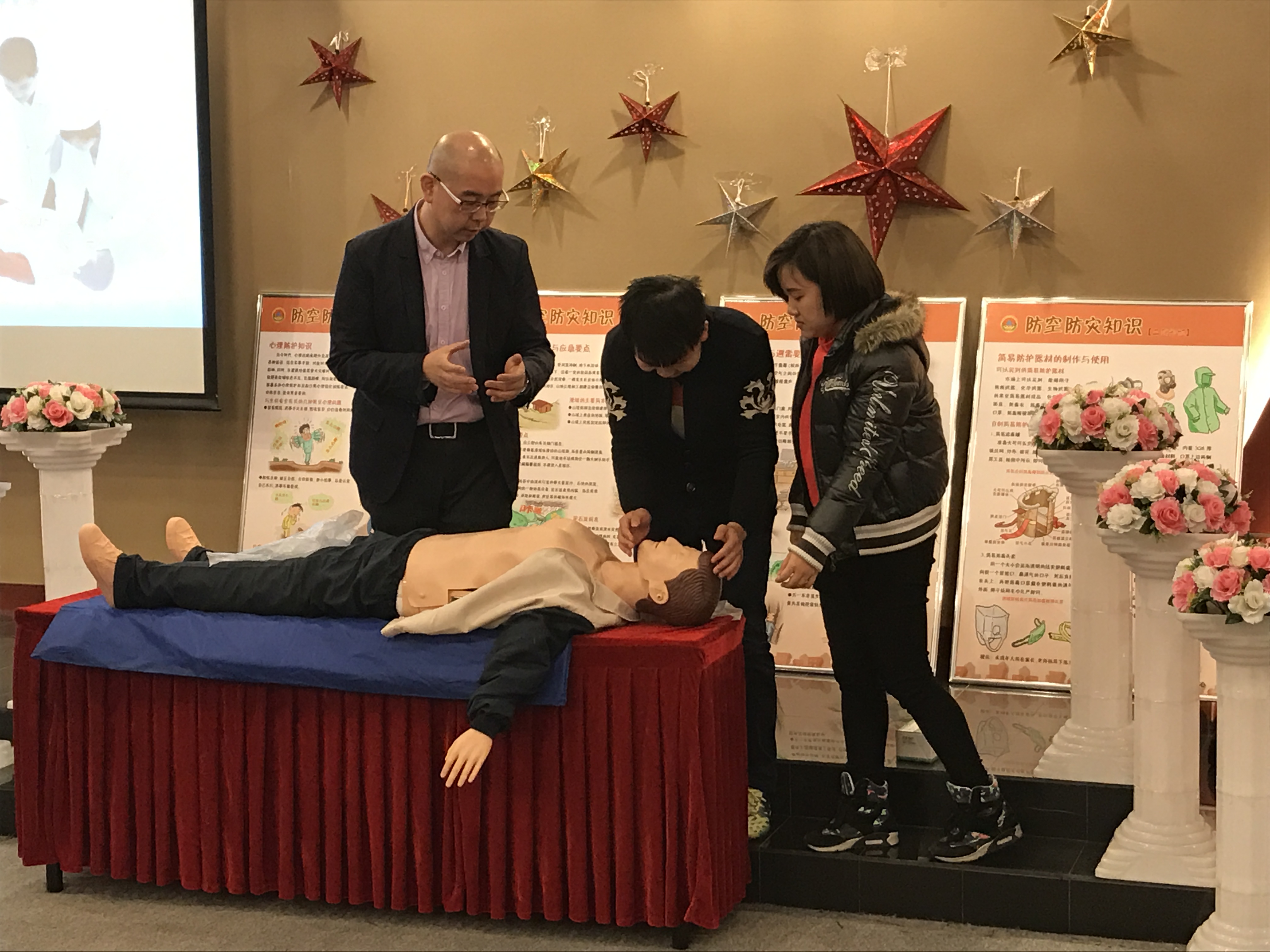 上海民防教育馆的工作人员带来自救互救防护技能进行实操讲解。首先是灭火器的使用方法和注意事项,演示了“一查二晃三拔四喷”的操作技巧。接着配合人型模具讲解急救当中心肺复苏的准备、按压、气道打开、人工呼吸等相关知识。互动环节,同学们上台操作,实践学习内容。