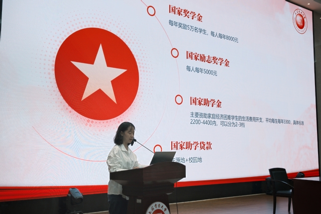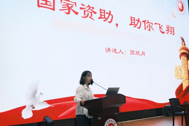 高欣月以《国家资助,助你飞翔》为题,详细地为23级新生介绍了学校“奖、助、贷、勤、补、减”六位一体资助体系。主要围绕学生资助政策的最新动态和具体实施细则展开,包括国家奖学金、国家助学金、国家助学贷款等国家资助项目以及校奖学金、勤工助学、学费减免等学校资助项目。高欣月详细介绍了各项资助政策的申请时间、申请标准、评审条件等。并对家庭经济困难认定以及评审程序做了细致讲解。最后,高欣月特别强调诚信与感恩教育,希望同学们提高诚信意识和责任意识,积极践行社会主义核心价值观,促进自身全面发展。