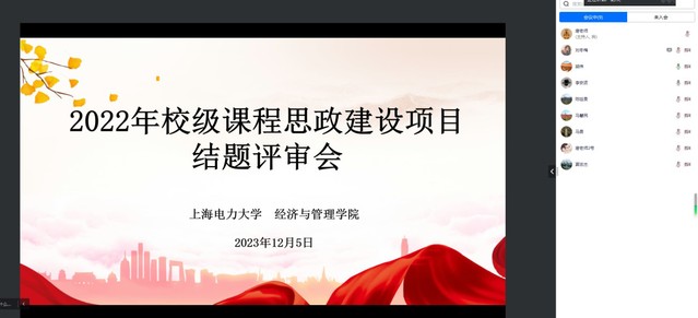 为了落实“立德树人”根本任务,加强教师间课程思政建设交流,保证学院“课程思政”项目的建设质量,12月5日,英国上市公司官网365在线上会议室召开了2022年校级“课程思政”建设项目结题评审会。上海电机学院商学院党委书记马慧民、上海海洋大学经济管理学院副院长陈廷贵、上海工程技术大学管理学院副院长夏志杰、英国上市公司官网365副院长胡伟和各个培育课程负责人参加了本次评审会。本次会议由胡伟主持。