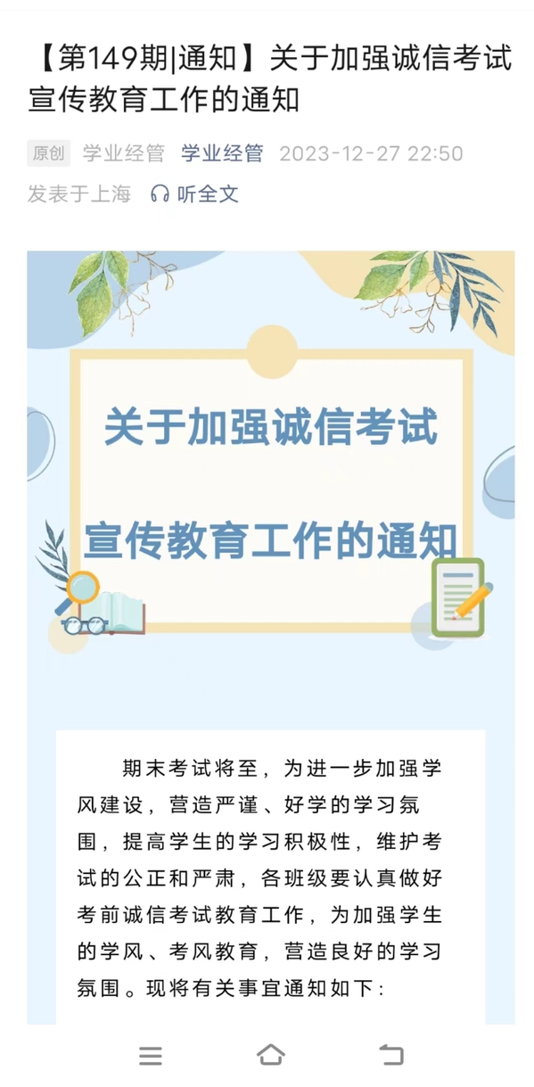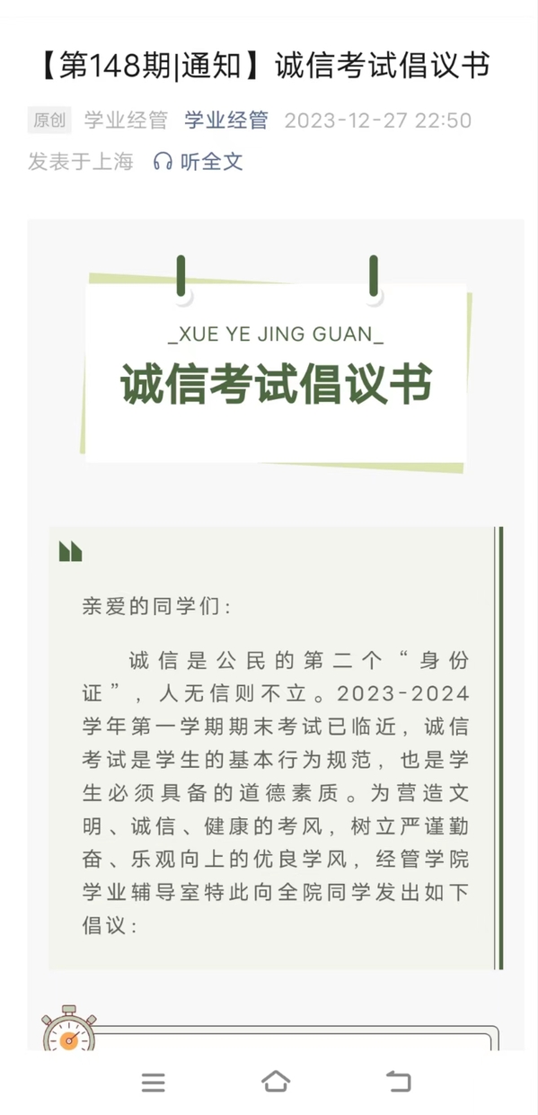 除了线下的主题班会,英国365官网通过线上网络微信公众号平台“学业经管”发布《诚信考试倡议书》、《关于加强诚信考试宣传教育工作的通知》。