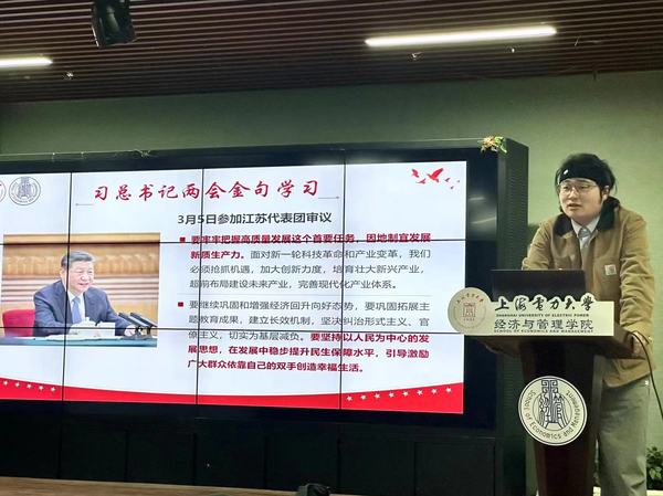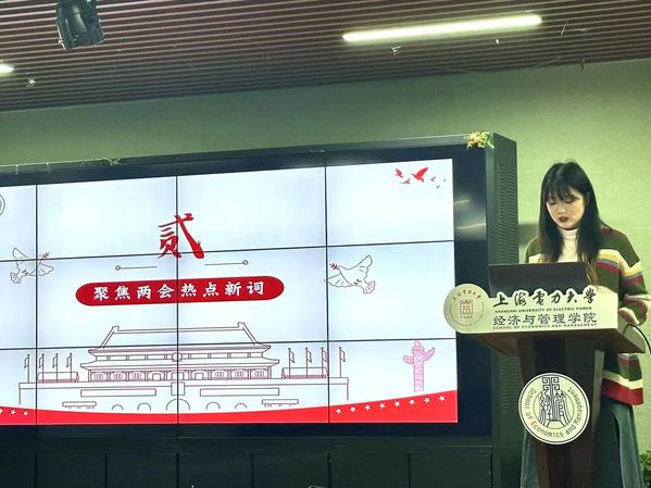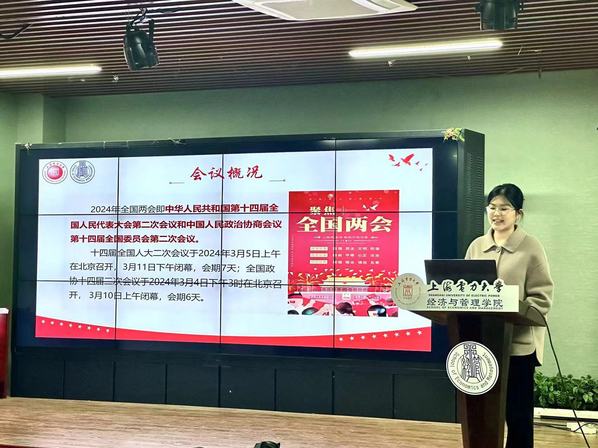 学生会主席团成员依次向同学们介绍两会的基本信息、新词热词、习近平总书记两会金句。通过深入了解两会的会议概况及2024《政府工作报告》,感受过去一年中国发展之欣欣向荣;通过聚焦于两会的新词热词,共同解读民生问题。主席团成员还结合当下“就业”形势和同学们分享心得。最后,通过习近平总书记两会金句学习,鼓励同学们应当注重培养科创精神,学习创新课程,为祖国的未来添砖加瓦。