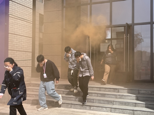 13:30分,消防演习总指挥学院党委书记张艺宣布了此次火灾疏散逃生演习正式开始。随着烟雾弹释放,火警警报响起,师生按指定方向有序撤离,逃生过程中师生掩住口鼻、弯腰前行、有序、小跑疏散。从火警警报响起到全员撤离到学院一楼安全区域,历时1分钟18秒,整个演练过程做到快速、安全、有序。撤离完毕后,消防专员现场讲解灭火器使用方法,并组织师生进行了灭火演习。