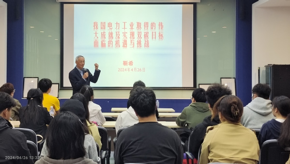 然后,特邀电气工程学院关工委常务副主任、校“五老”理论宣讲团靳希教授做题为《我国电力工业的伟大成就及新时代面临的机遇与挑战》的讲座。靳希教授带领学员们回顾了电力工业发展历程,强调绿色转型与科技创新,鼓励上电青年积极参与,为绿色发展贡献青春力量,助力中华民族伟大复兴。
