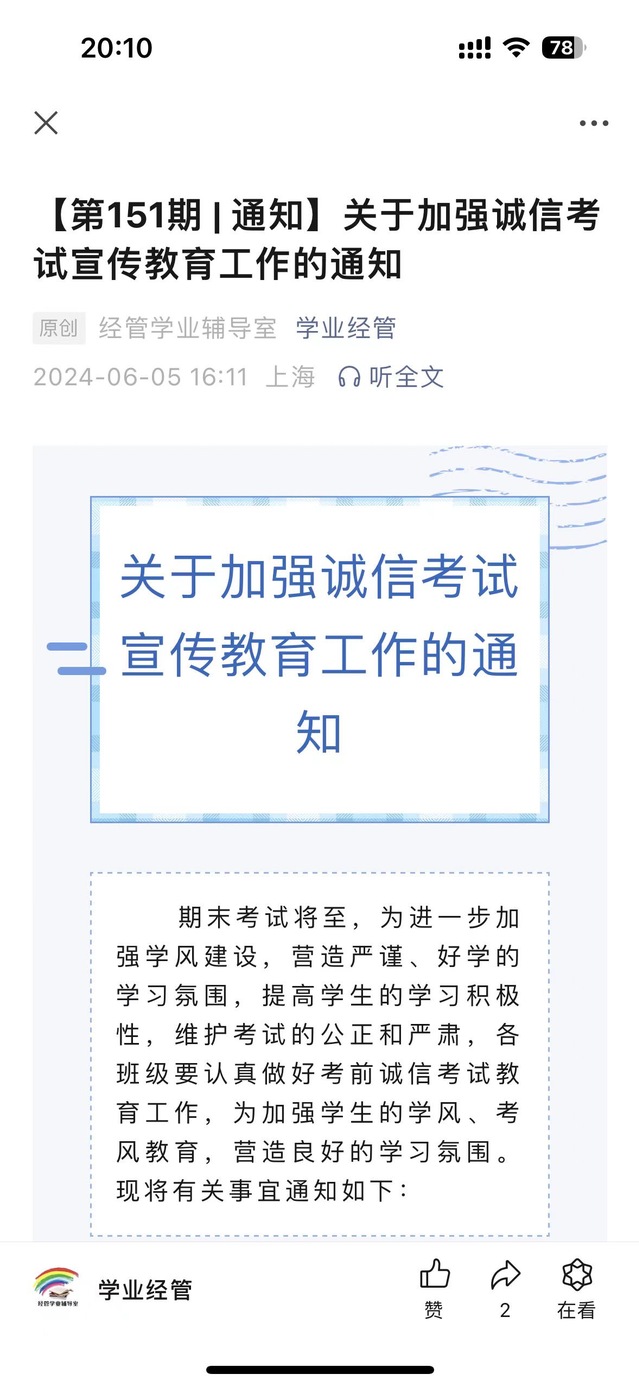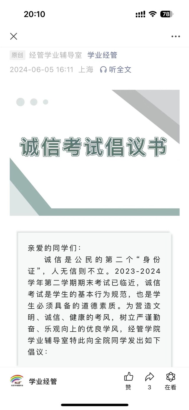 除了线下的主题班会,英国365官网通过线上网络微信公众号平台“学业经管”发布《诚信考试倡议书》、《关于加强诚信考试宣传教育工作的通知》。