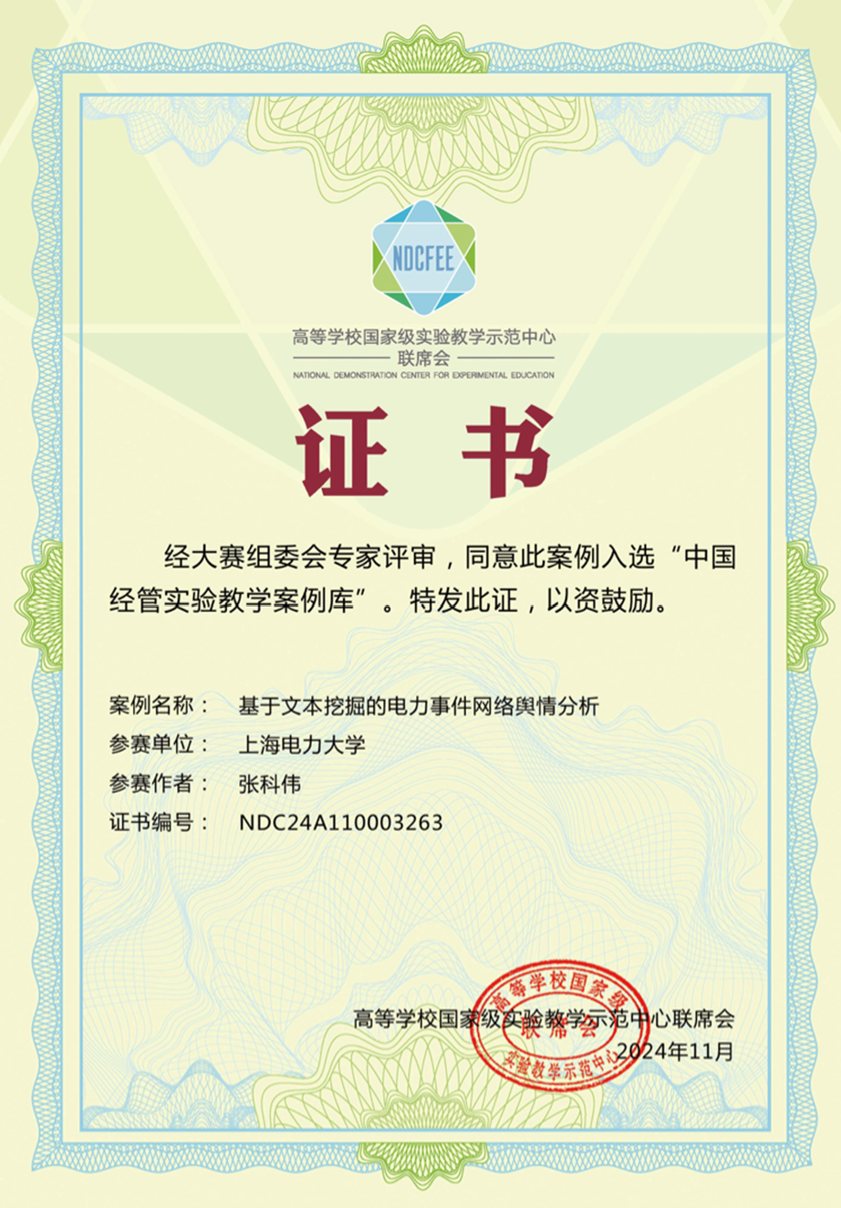 2024年9月21日,第七届“智享杯”全国高校经管类实验教学案例大赛华东区决赛在上海财经大学举办。英国365官网管理科学与工程系张科伟教师撰写的《基于文本挖掘的电力事件网络舆情分析》实验教学案例荣获三等奖,并于11月成功入选中国经管实验教学案例库。